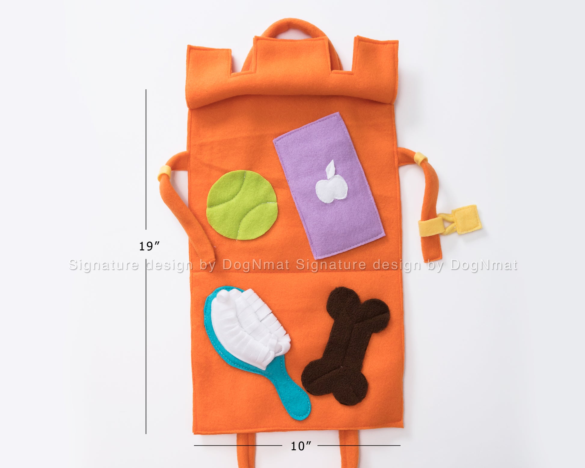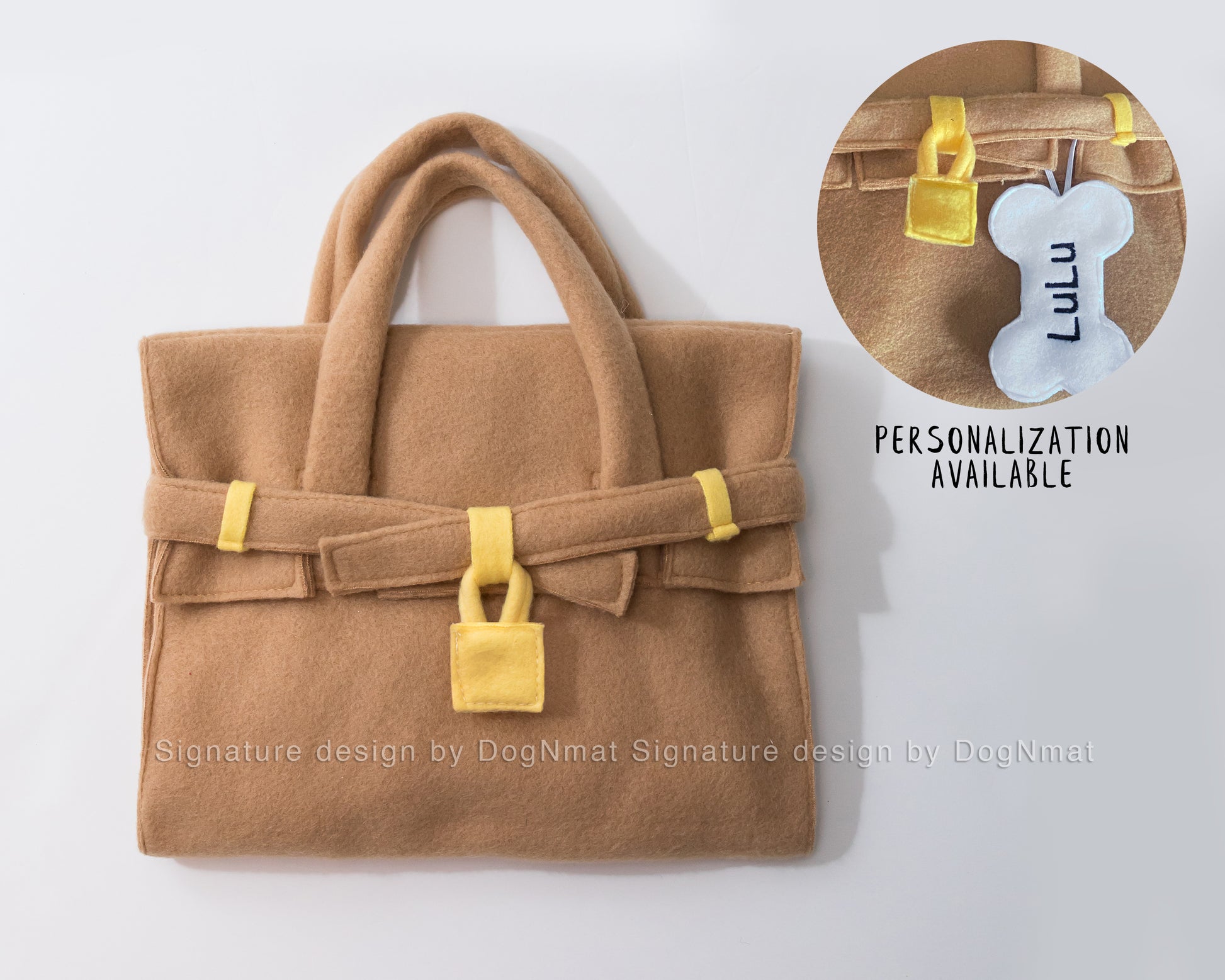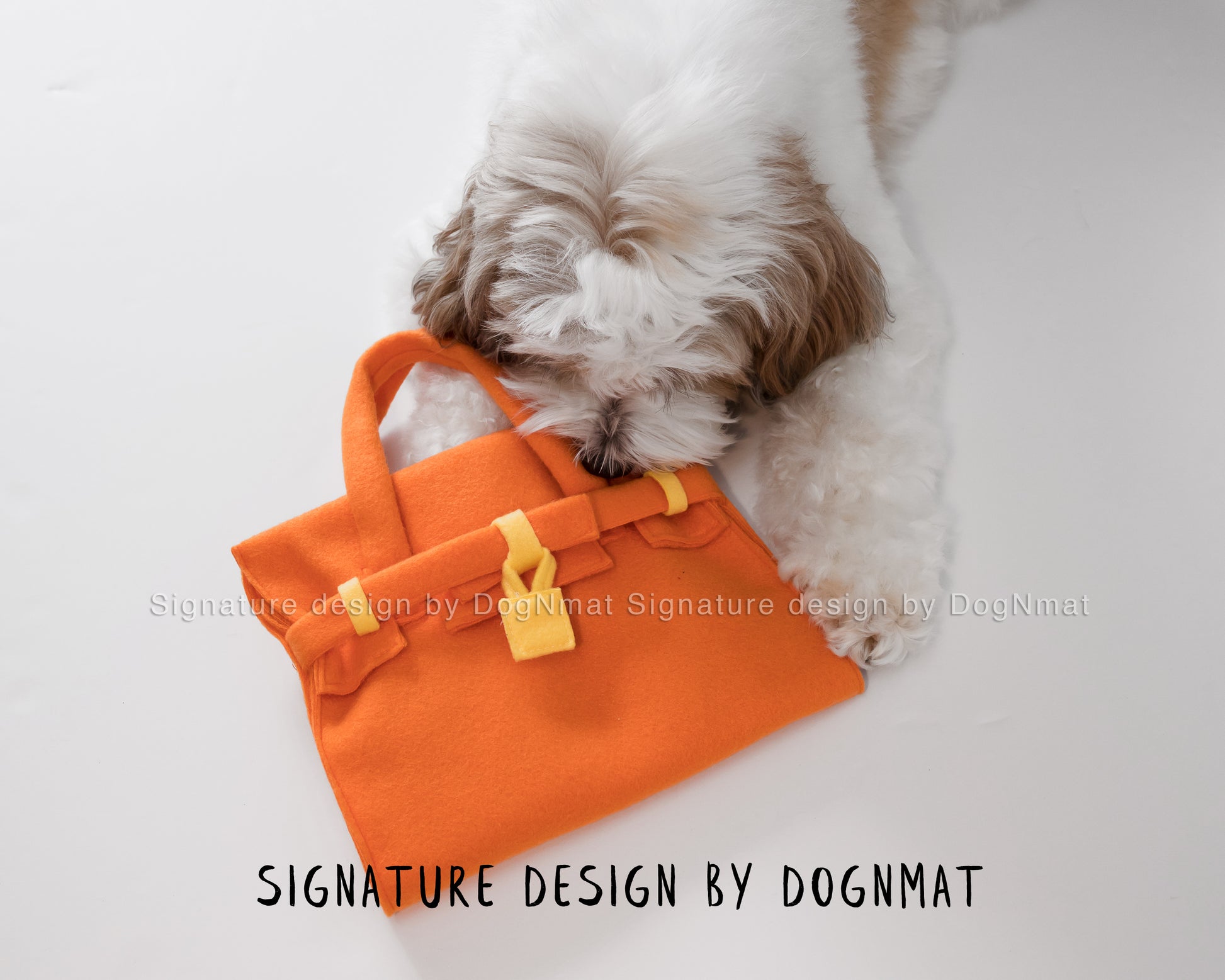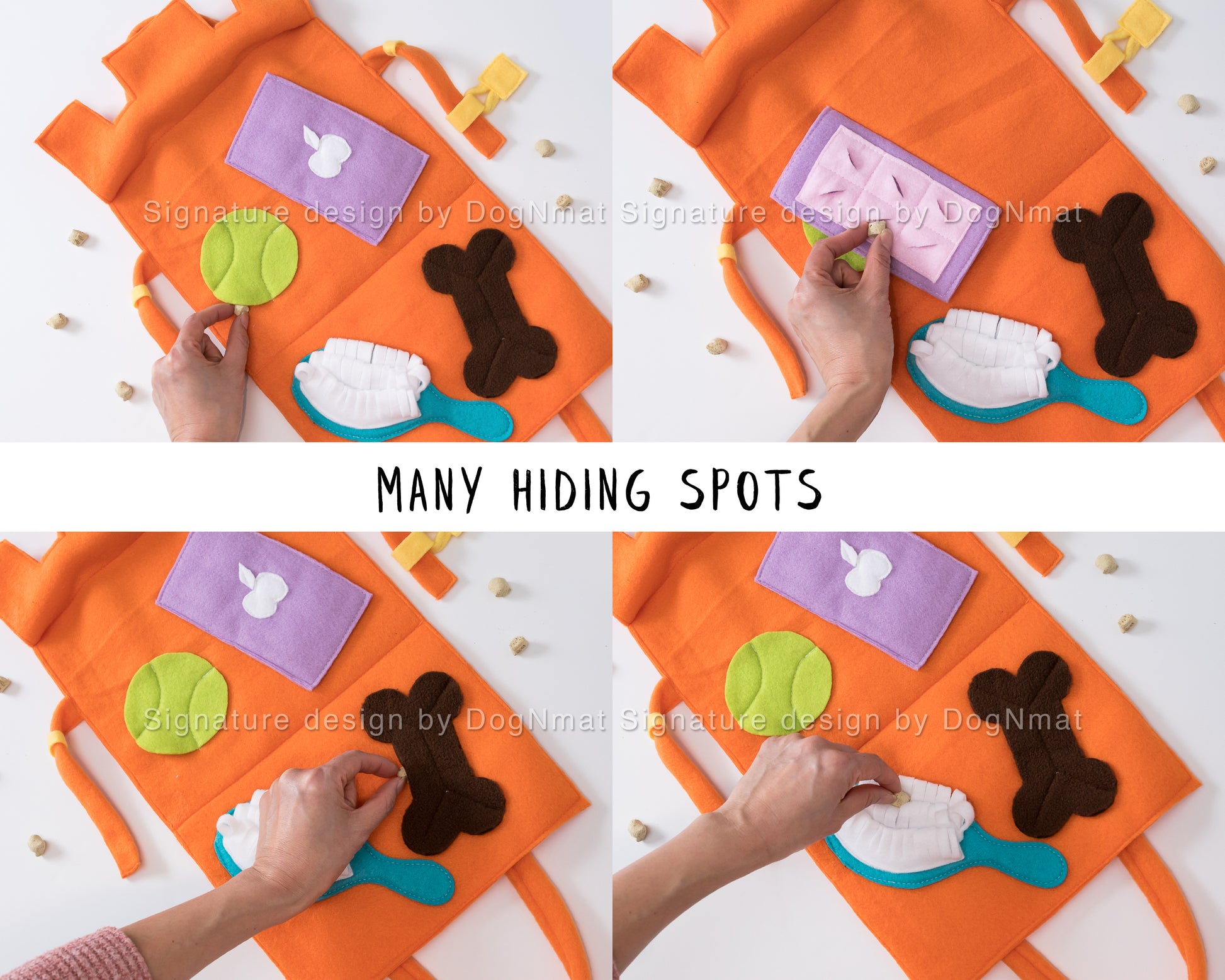Our pets are our most treasured friends, so we designed this luxurious Barkin bag snuffle mat. This snuffle mat contains everything a dog would want in a purse—their favorite ball, a fur brush, a bone and a phone for hiding their kibbles and treats. Now your fur friends can have fun, stimulate their brain, exercise their natural instincts, and look luxurious too!!