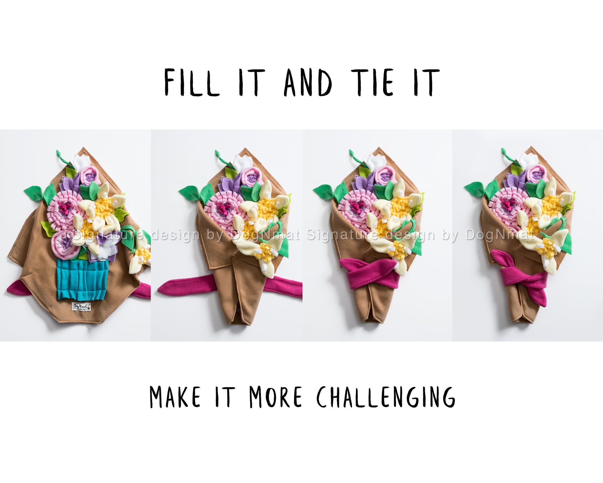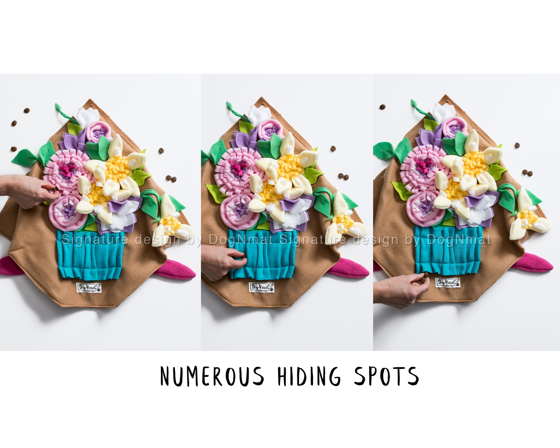 Introducing the pet friendly bouquet by DogNmat! Now, you can give your dog their very own bouquet that has a countless number of hiding places for treats, and kibble, intricate flowers that will never wilt, and a ribbon that can be tightened to control the difficulty of the mat. Not only is it a fun way to feed your dog, but it also stimulates their brains, brings out their natural instinct to forage for food, and slows down eating habits!