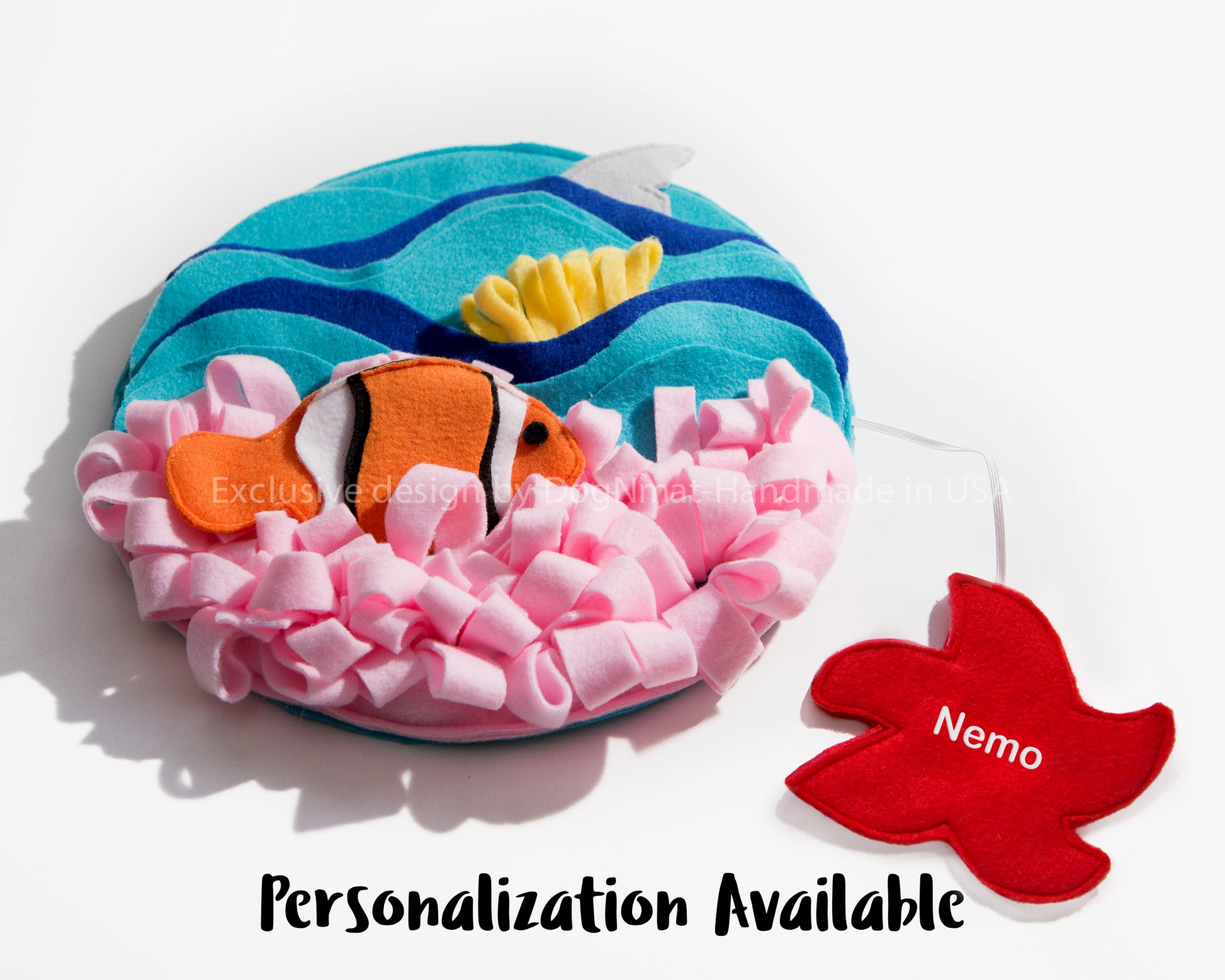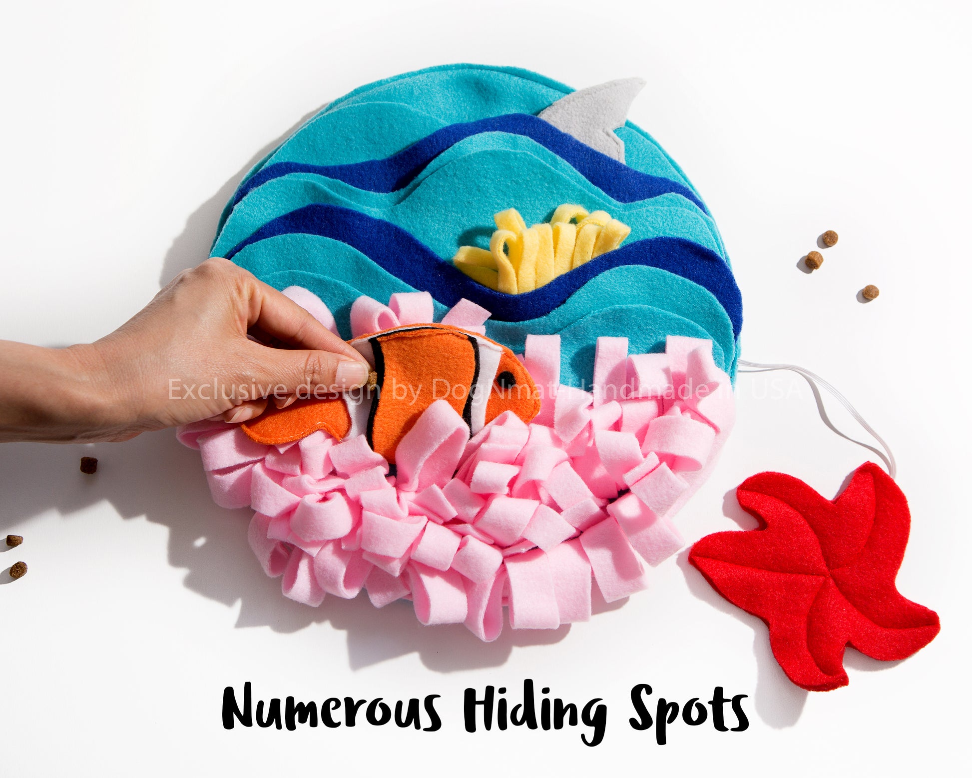 We designed this underwater theme snuffle mat just for finding kibble and treats, not Nemo! Watch out for the shark!!!