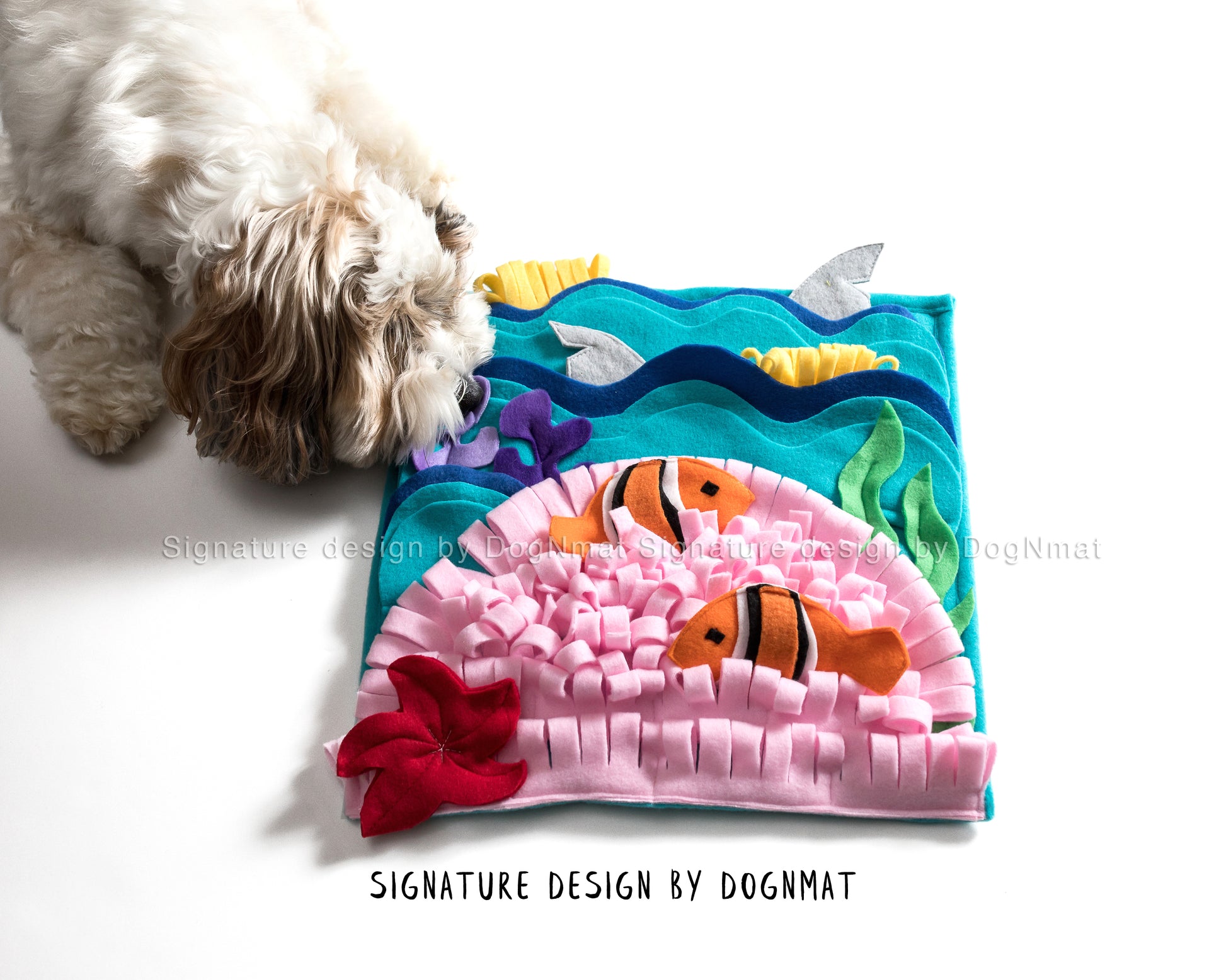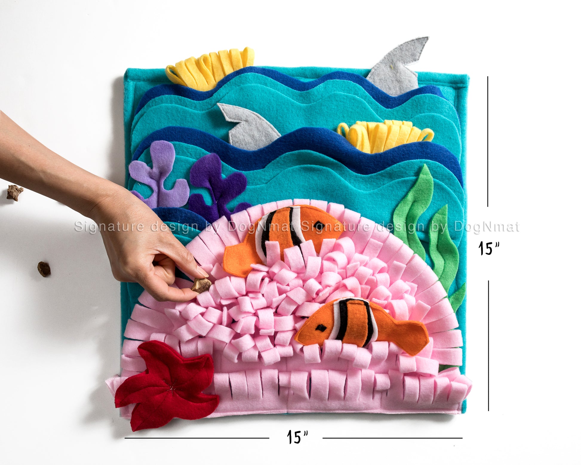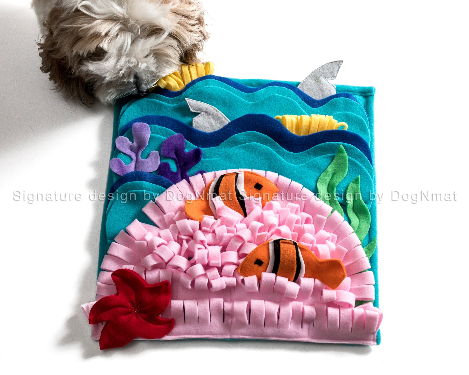 We designed this underwater theme snuffle mat just for finding kibble and treats, not Nemo! Watch out for the shark!!!