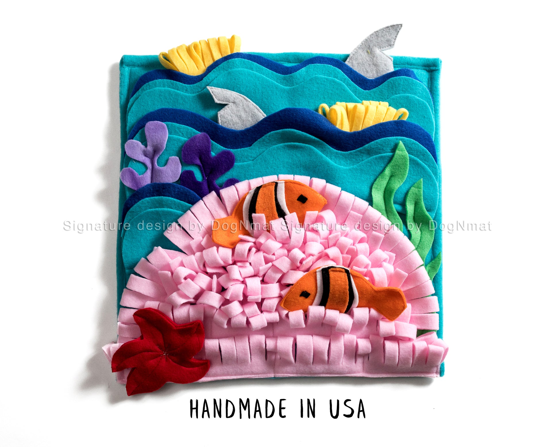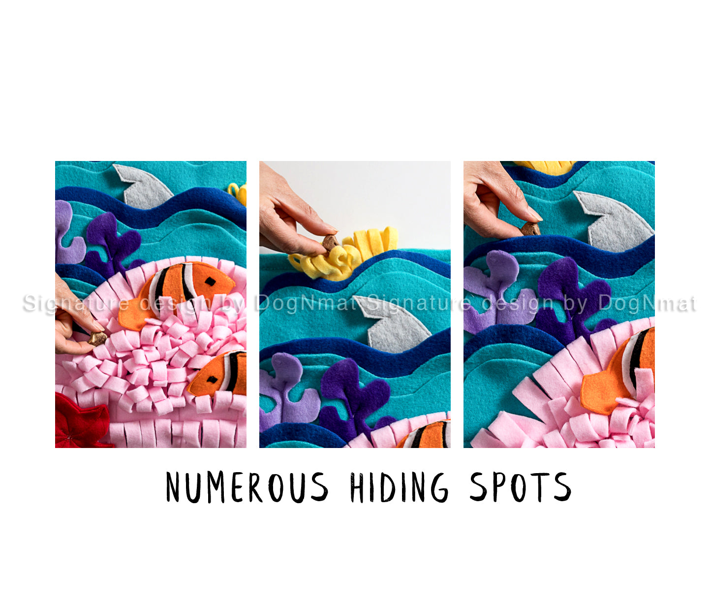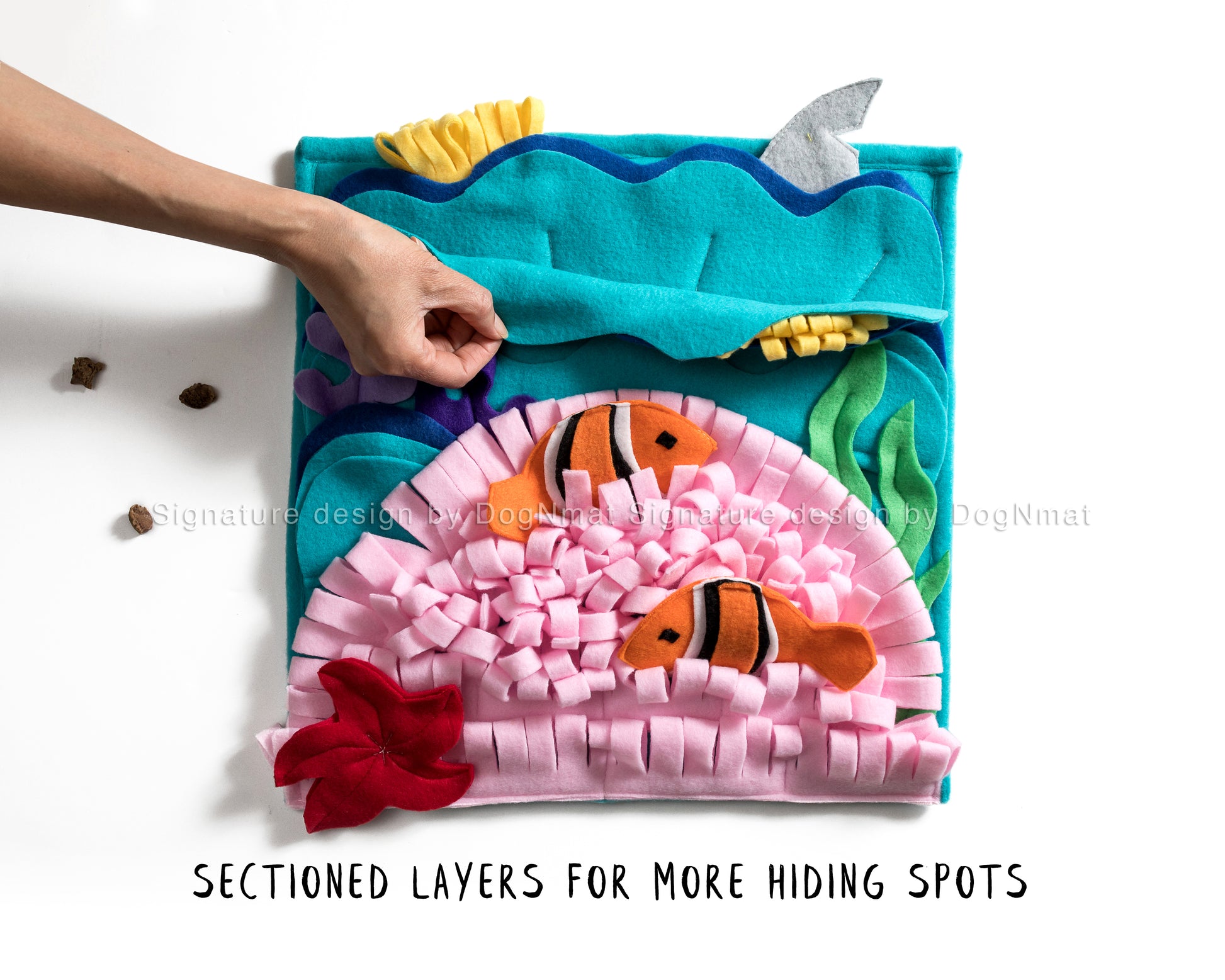 We designed this underwater theme snuffle mat just for finding kibble and treats, not Nemo! Watch out for the shark!!!