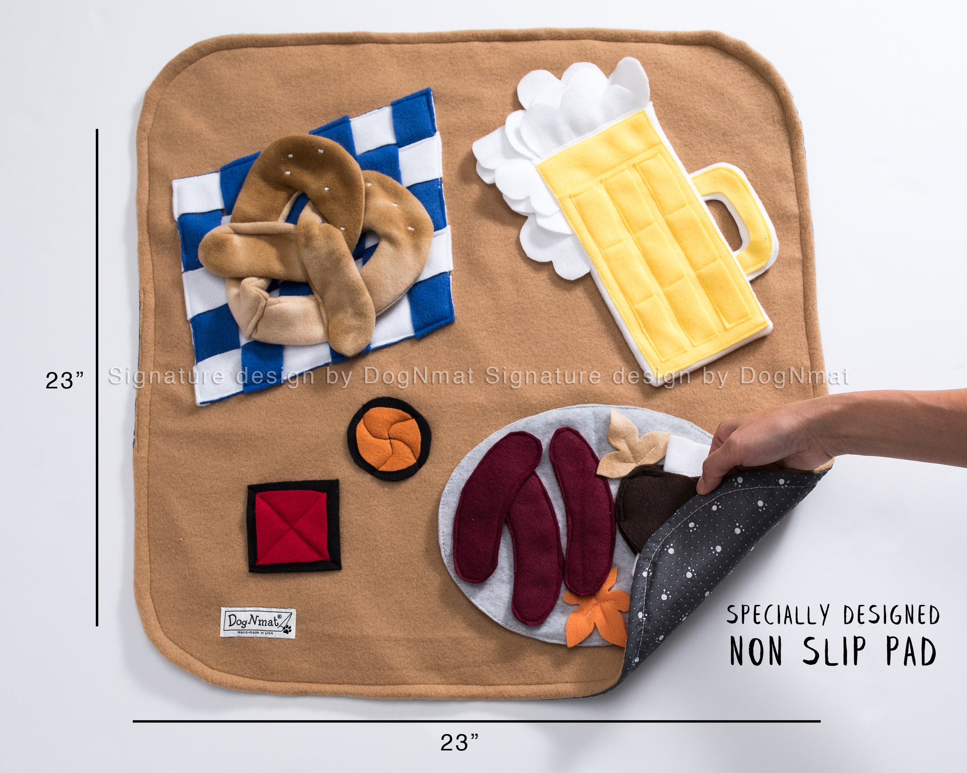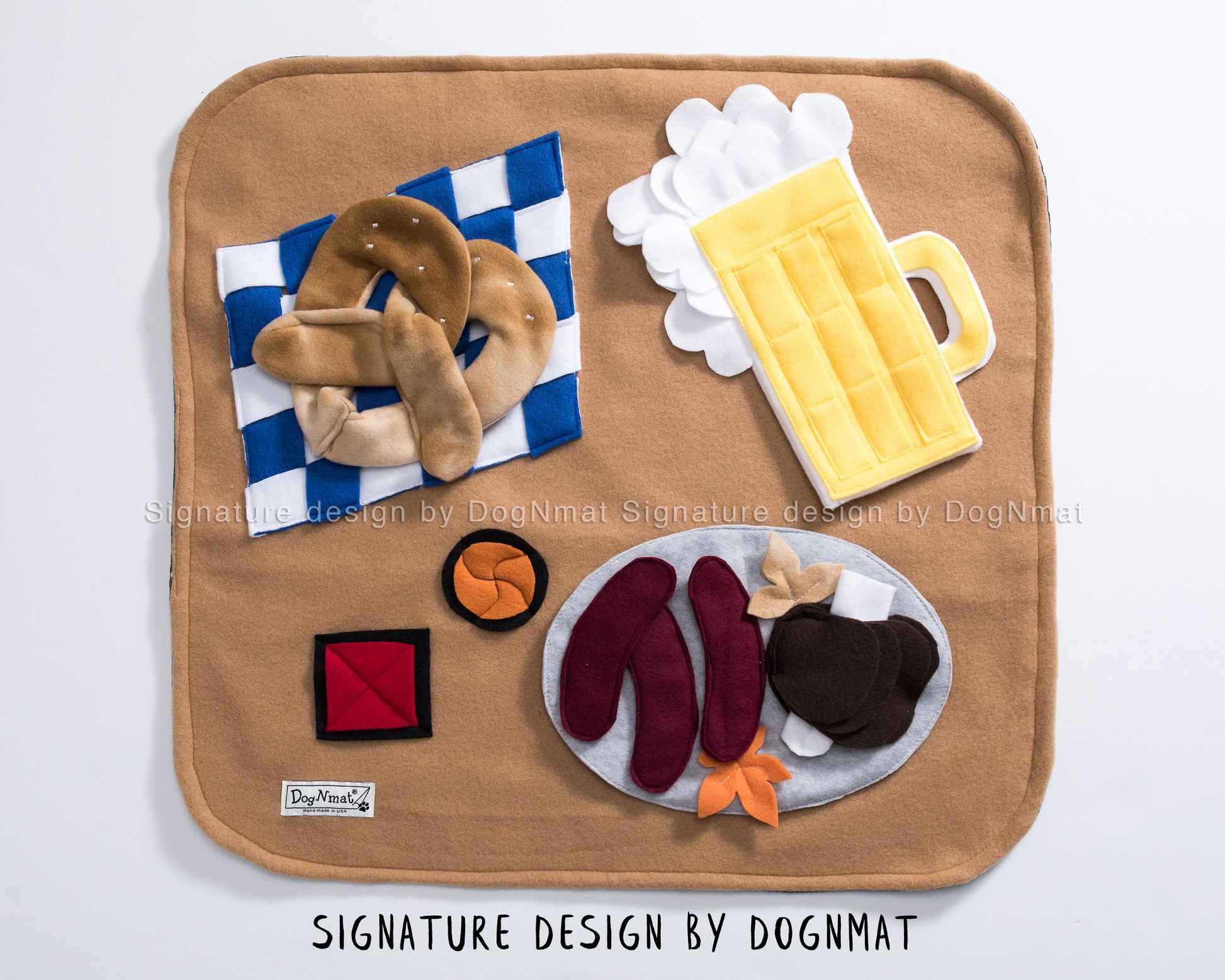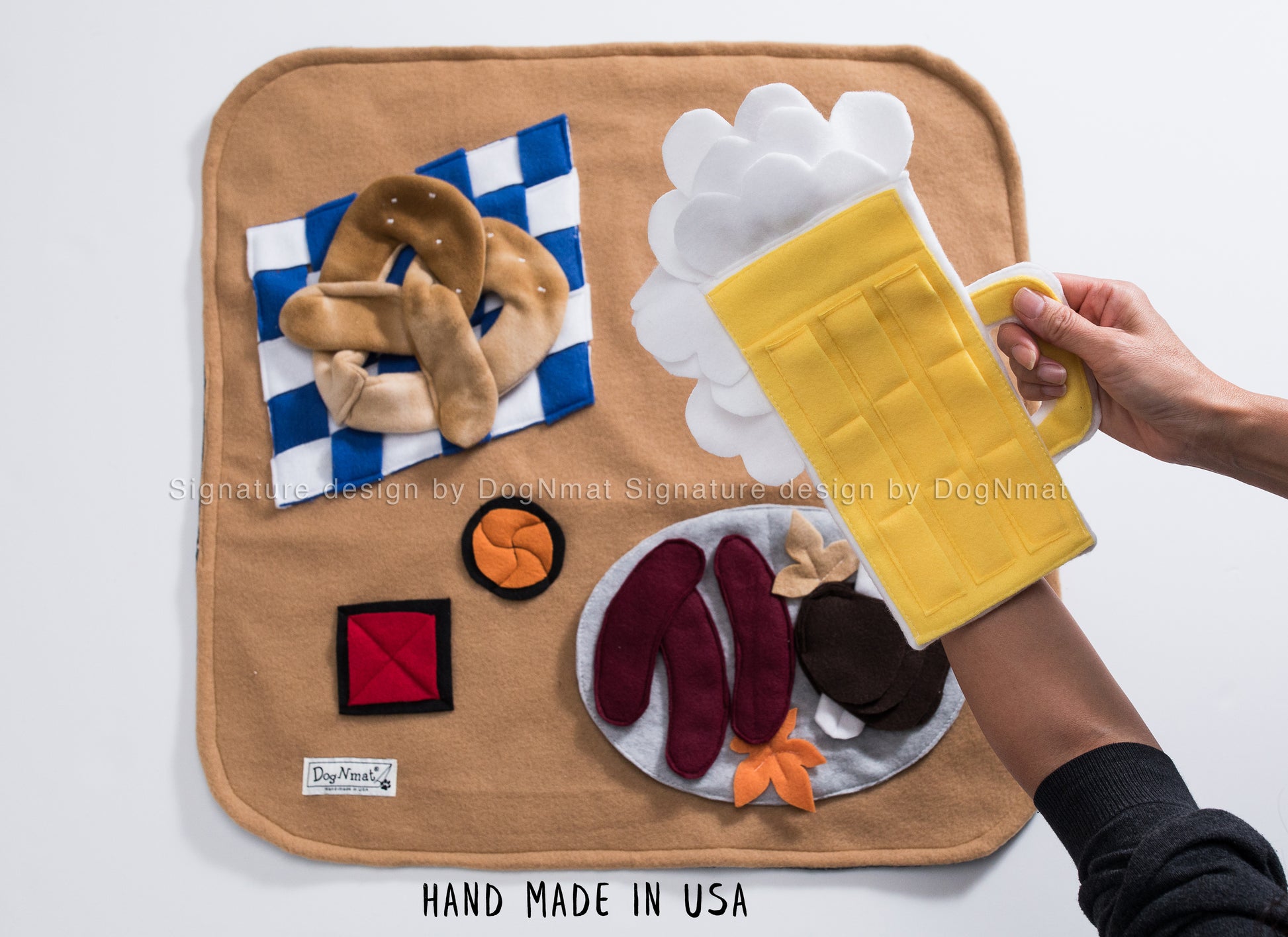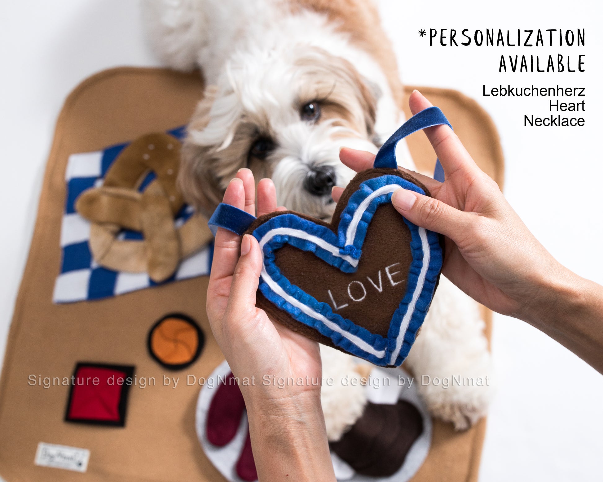 We designed this Oktoberfest snuffle mat so you and your fur babies can celebrate the German festival all year round! This mat includes all Oktoberfest foods! There’s a 1 liter jug of beer, a giant pretzel, sausages, and schweinshaxe (roasted pork knuckle). This holds so many hiding spots and is a festive brain game for your dog! To make it extra special, you can personalize a Lebkuchenherzen (a heart cookie shape necklace) for your dog by adding a special message or their name. Don't worry, the beer is alcohol-free!