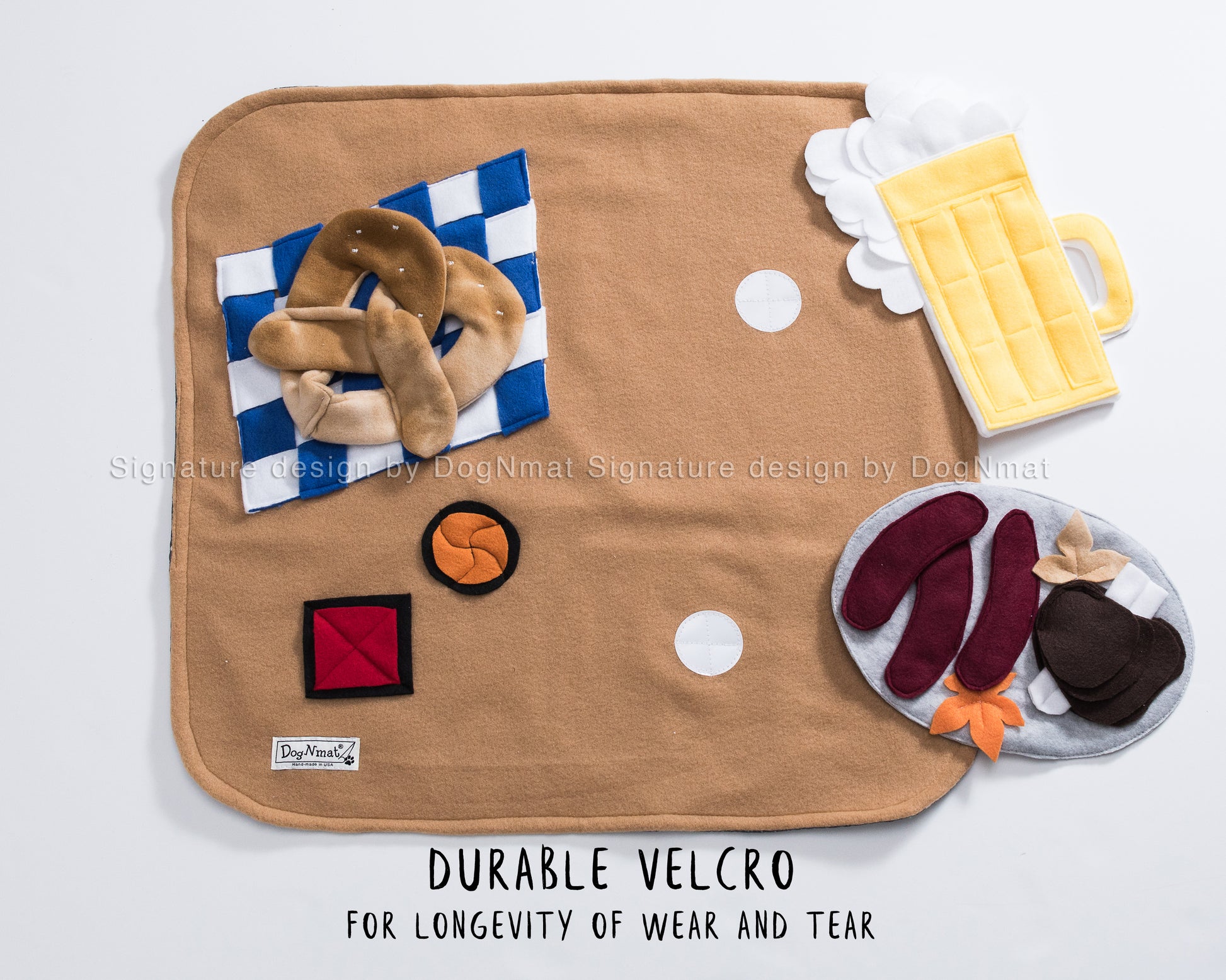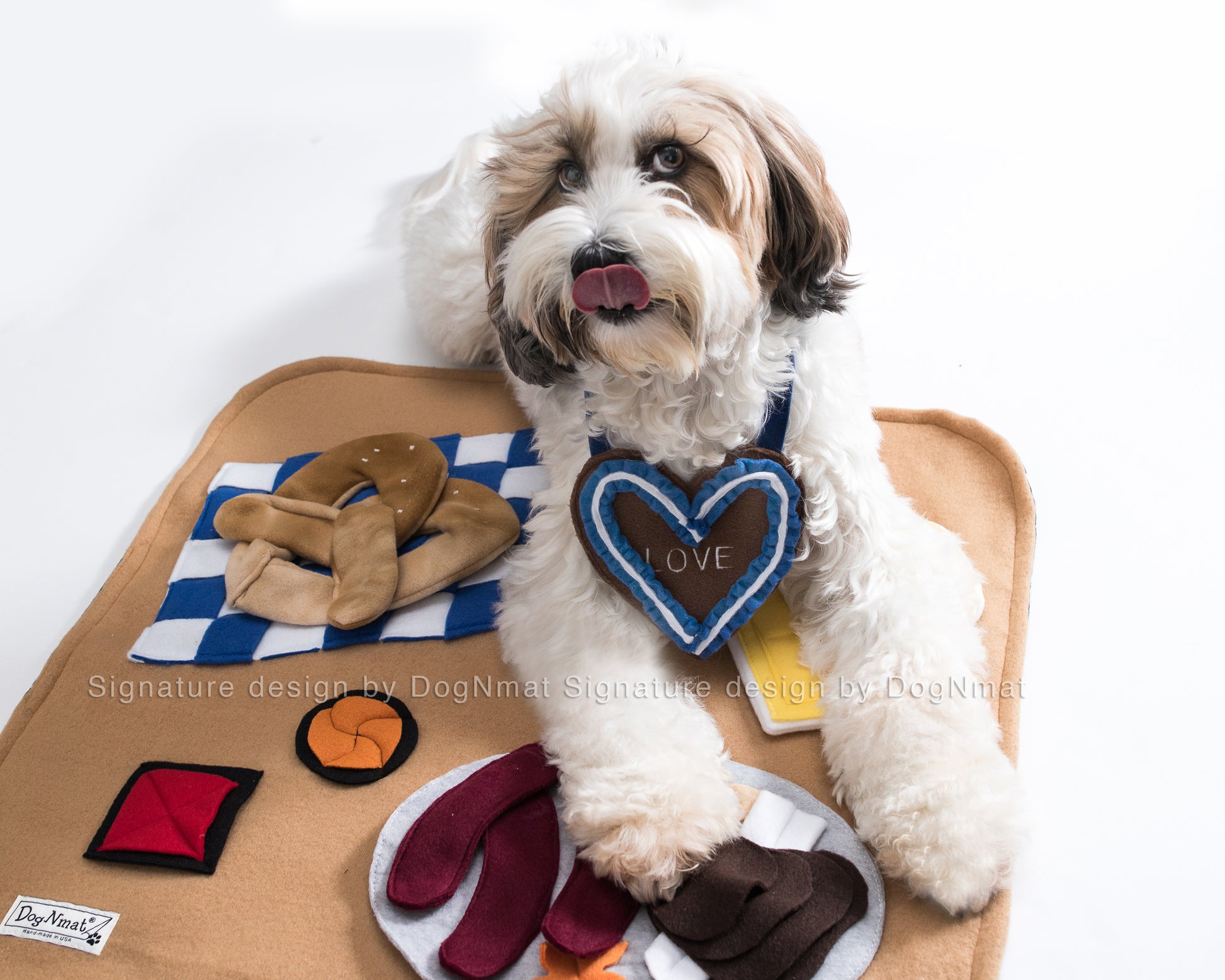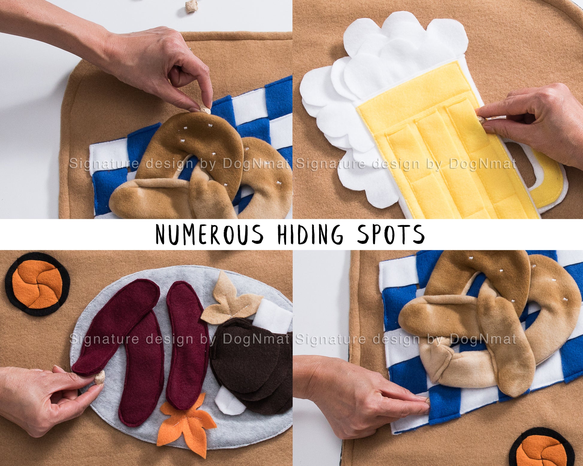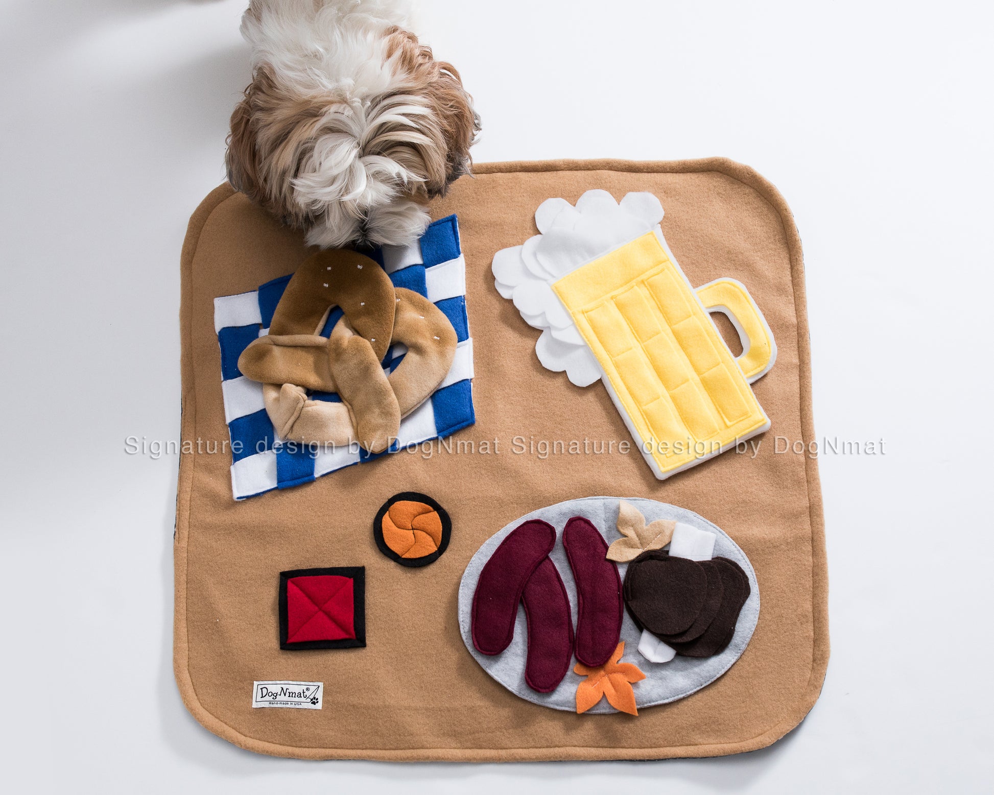 We designed this Oktoberfest snuffle mat so you and your fur babies can celebrate the German festival all year round! This mat includes all Oktoberfest foods! There’s a 1 liter jug of beer, a giant pretzel, sausages, and schweinshaxe (roasted pork knuckle). This holds so many hiding spots and is a festive brain game for your dog! To make it extra special, you can personalize a Lebkuchenherzen (a heart cookie shape necklace) for your dog by adding a special message or their name. Don't worry, the beer is alcohol-free!