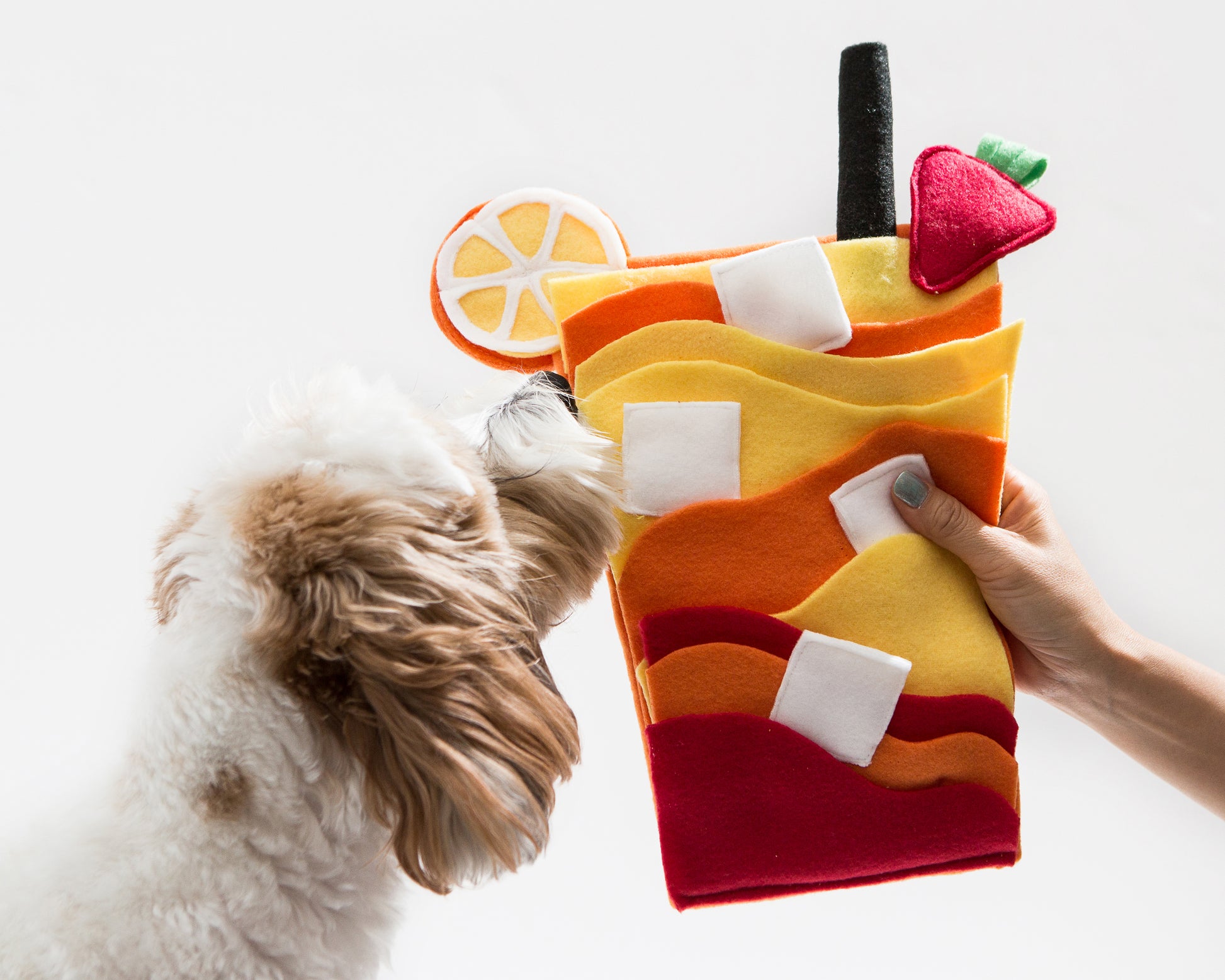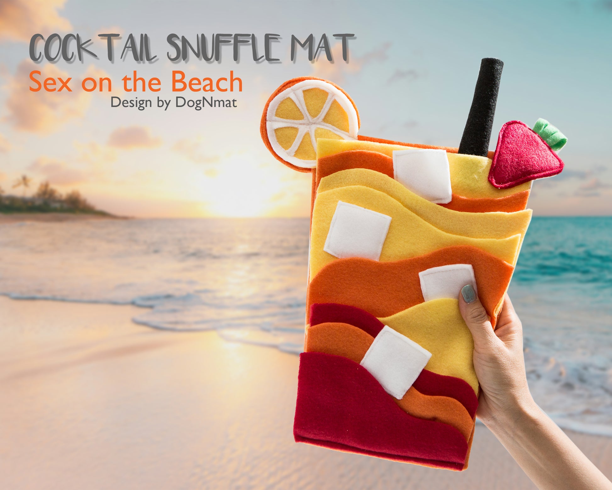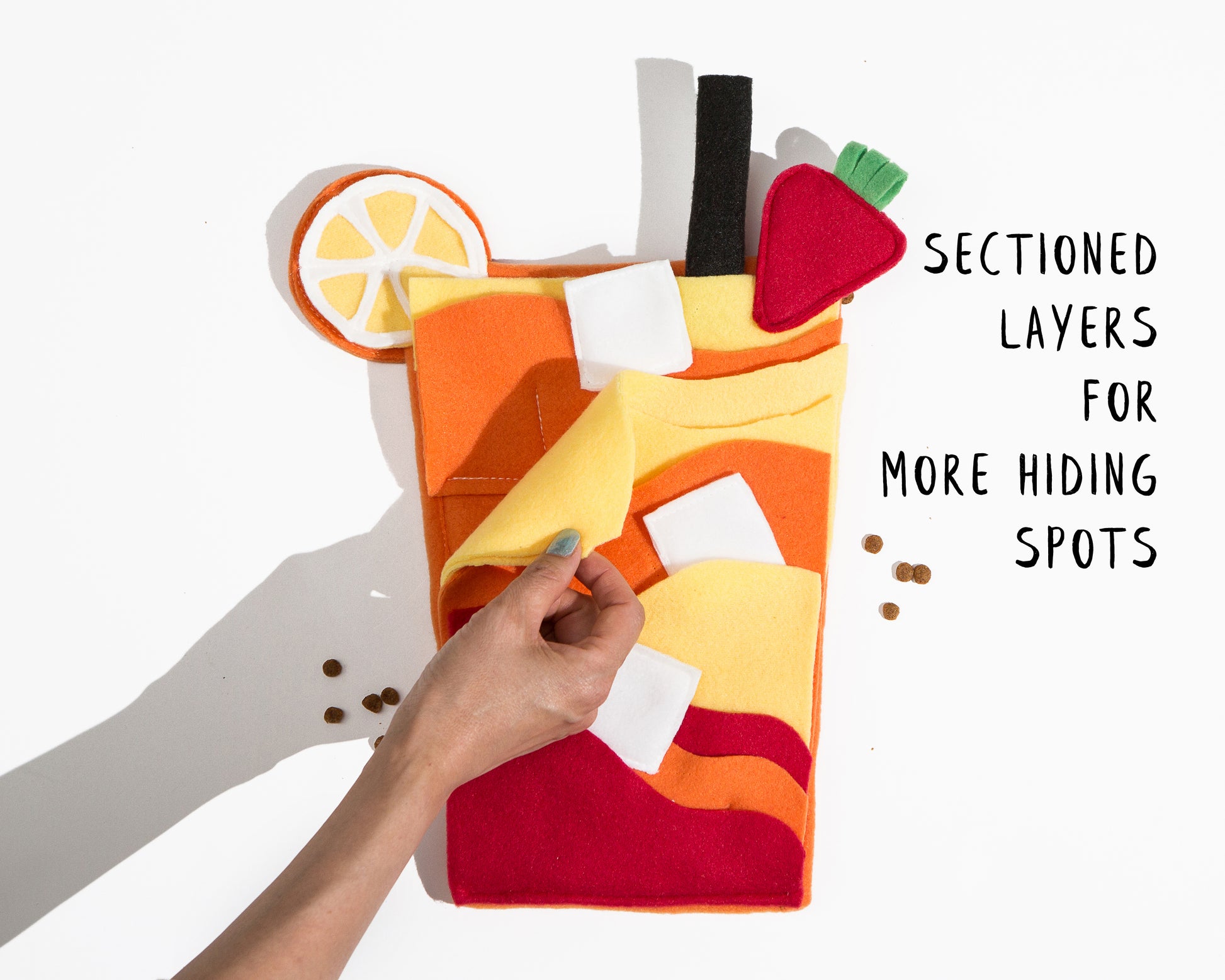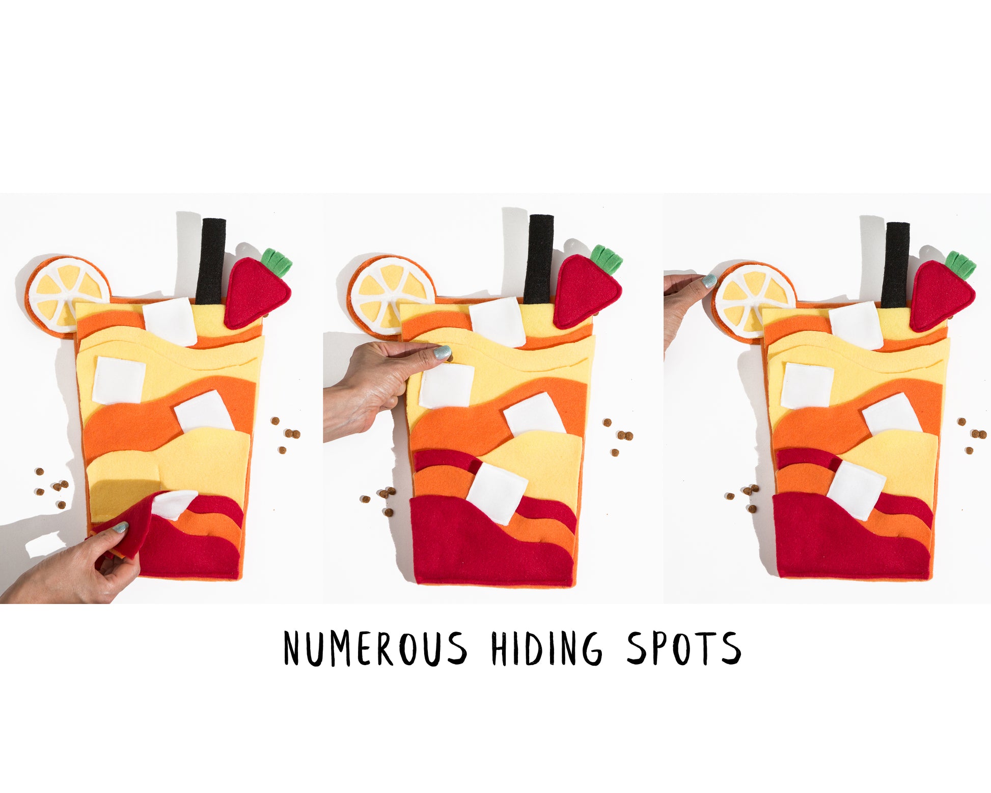 Peachy, tart, and citrusy, Sex on the Beach is the perfect summer cocktail! This snuffle mat version of this iconic refreshment has layers of “vodka,” “peach schnapps,” “Orange juice,” “cranberry juice,” and “ice cubes,” topped with an adorable orange and strawberry! While for you it’s perfect for relaxing in a much needed vacation, for your fur-friends it’s perfect for mental exercise and fun!